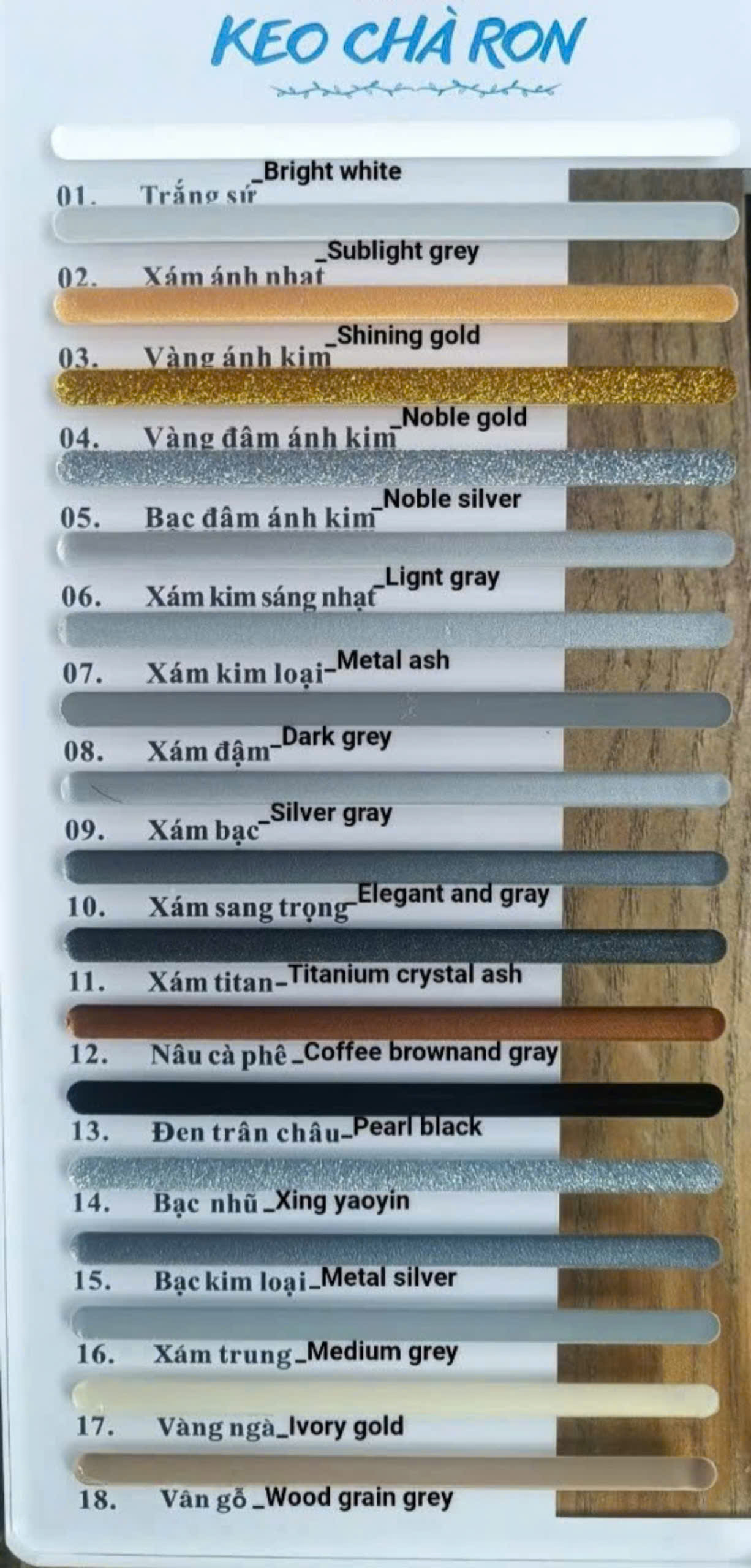 – Keo chít mạch Deyi, Keo chà ron KGT: đa dạng màu sắc như trắng, xám, vàng ánh kim, nâu gỗ, nâu cà phê… giúp ron gạch đồng bộ, bền màu, không bong tróc, không ố vàng sau nhiều năm.