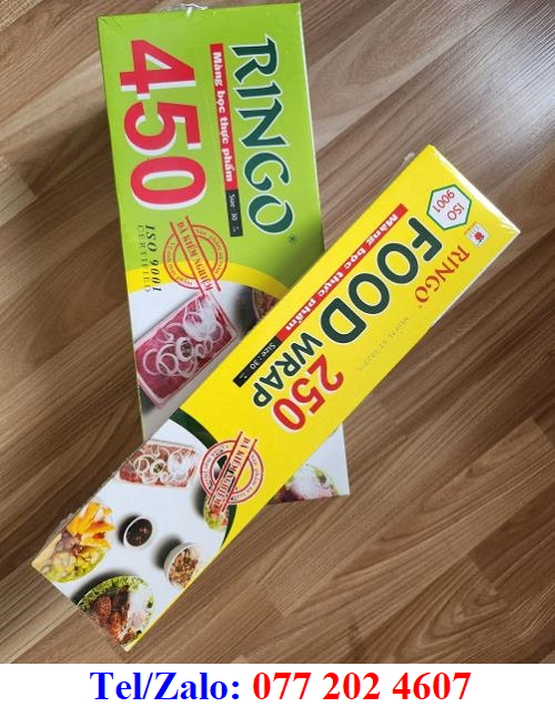 -Mỗi cuộn màng bọc được đặt trong một vỏ hộp giấy, có logo Ringo