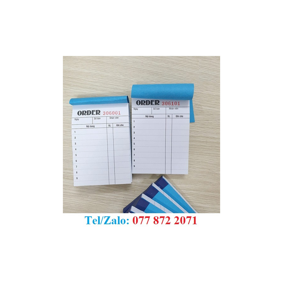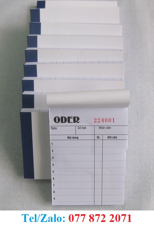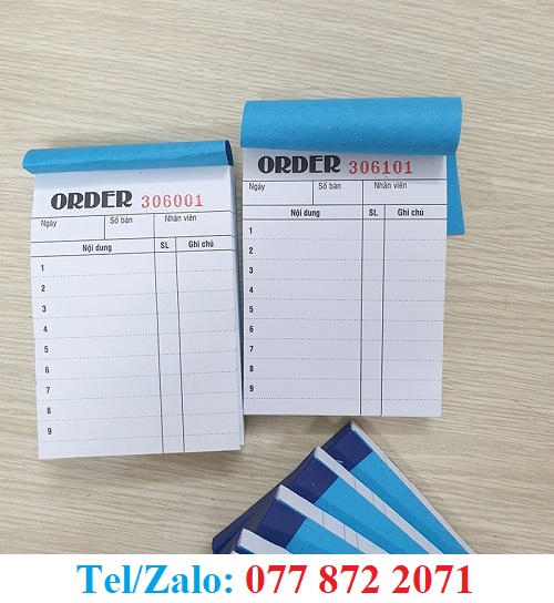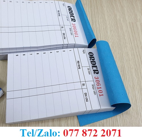 Giấy order 1 liên là loại giấy than Carbonless, có cấu tạo 1 lớp giấy duy nhất, Giấy in order 1 liên được sử dụng để ghi lại danh sách các món ăn, số lượng và yêu cầu đặc biệt của khách hàng và truyền thông tin đến bếp một cách nhanh chóng. Nhân viên phục vụ thực hiện ghi chép toàn bộ yêu cầu của khách hàng vào sổ order, giúp tránh sai sót trong việc gọi món và tính tiền.