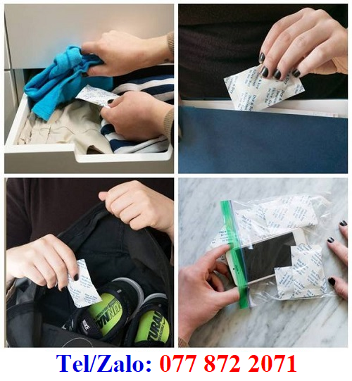 + gói chống ẩm mốc Silica gel hầu như được dùng cho rất nhiều vật dụng, từ thực phẩm, bánh kẹo đến quần áo, giày dép, máy ảnh, chi tiết cơ khí, máy móc, bánh trung thu, thuốc tây,…